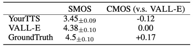 本研究では様々な評価指標でVALL-Eが比較されました。その中でもSMOSとCMOSを用いた評価結果をお伝えします。